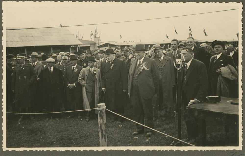 Latvijas Valsts un Ministru prezidents Kārlis Ulmanis, izglītības ministra Augusts Tentelis un zemkopības ministrs Jānis Birznieks Otro Latvijas Pļaujas svētku un Latgales Lauksaimniecības izstādes laikā Rēzeknē. 1. rindā no kreisās: 5. Augusts Tentelis, 6. Kārlis Ulmanis, aiz viņa labajā pusē Jānis Birznieks.