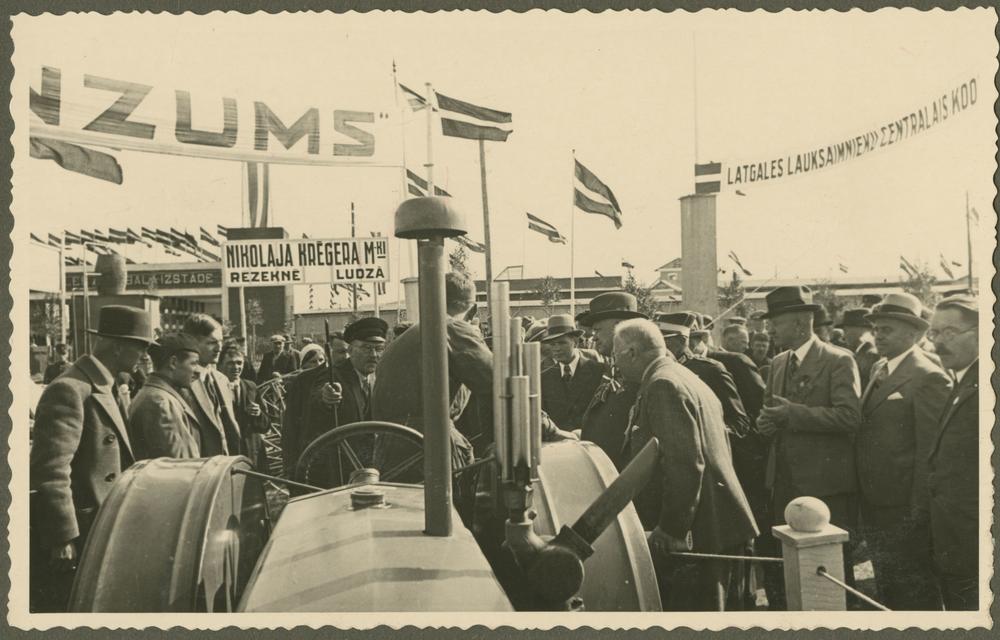 Latvijas Valsts un Ministru prezidents Kārlis Ulmanis un viņu pavadošās personas aplūko lauksaimniecības tehnikas eksponātus, viesojoties Latgales Lauksaimniecības izstādē Otro Latvijas Pļaujas svētku laikā Rēzeknē. Izkārtne "Nikolaja Krēgera M-ki. Rēzeknē, Ludzā". No labās: 5. Kārlis Ulmanis.
