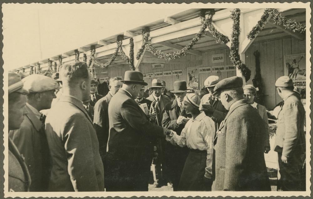Latvijas Valsts un Ministru prezidents Kārlis Ulmanis sasveicinās ar mazpulku biedri, viesojoties Latgales Lauksaimniecības izstādē Otro Latvijas Pļaujas svētku laikā Rēzeknē.