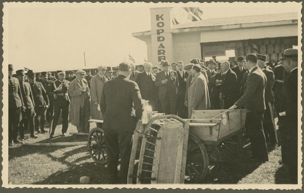 Latvijas Valsts un Ministru prezidents Kārlis Ulmanis (centrā) aplūko Madonas ratnieka Augusta Mazura izgudrojumu - jauna veida piena transporta ratus, viesojoties Latgales Lauksaimniecības izstādē Otro Latvijas Pļaujas svētku laikā Rēzeknē.