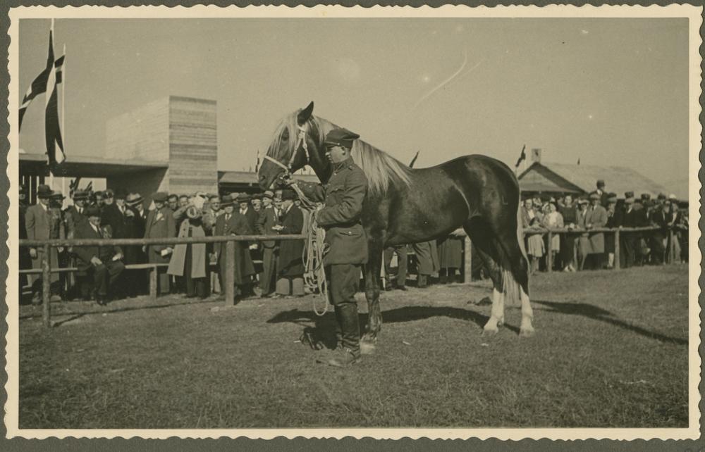 Latvijas Valsts un Ministru prezidents Kārlis Ulmanis (sēž kreisajā pusē) vēro zirgkopības paviljona demonstrējumus, viesojoties Latgales Lauksaimniecības izstādē Otro Latvijas Pļaujas svētku laikā Rēzeknē.