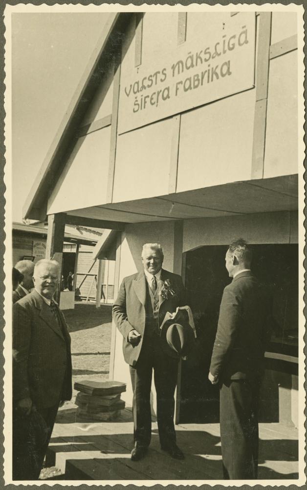 Latvijas Valsts un Ministru prezidents Kārlis Ulmanis (centrā) pie Valsts mākslīgā šīfera fabrikas paviljona ieejas, viesojoties Latgales Lauksaimniecības izstādē Otro Latvijas Pļaujas svētku laikā Rēzeknē.