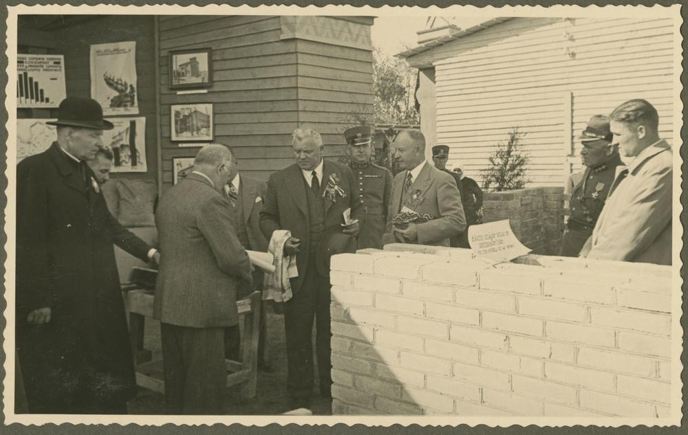 Latvijas Valsts un Ministru prezidents Kārlis Ulmanis (centrā) aplūko celtniecības materiālu paviljona ekspozīciju, viesojoties Latgales Lauksaimniecības izstādē Otro Latvijas Pļaujas svētku laikā Rēzeknē. No kreisās: 1. izglītības ministra biedrs, garīdznieks Jāzeps Čamanis.