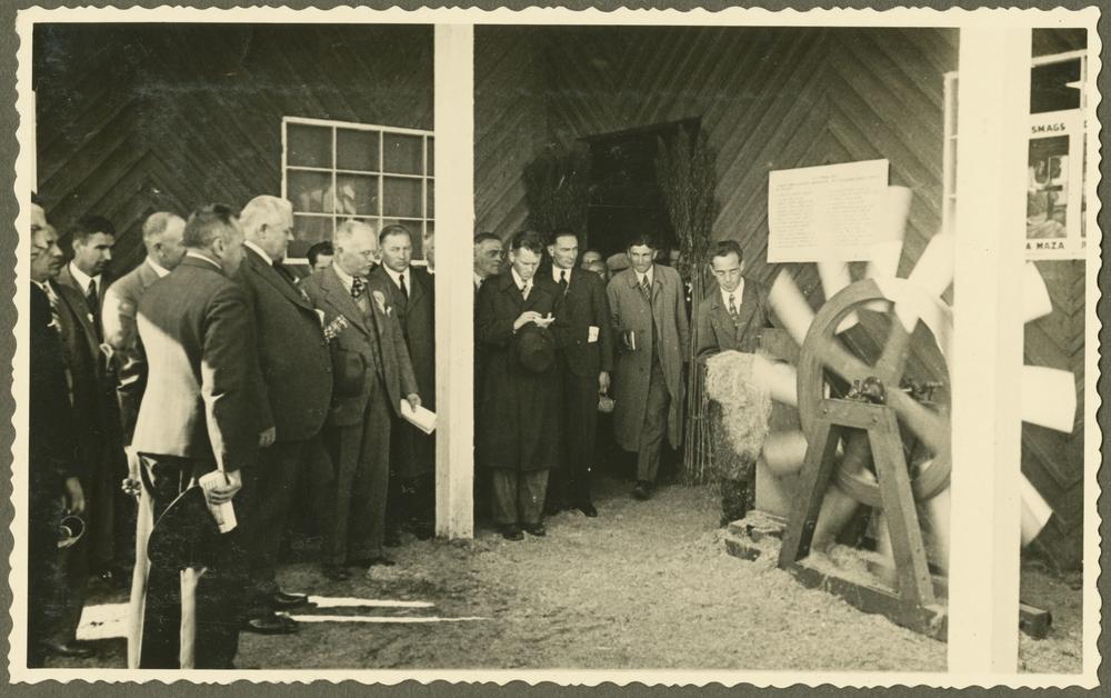 Latvijas Valsts un Ministru prezidents Kārlis Ulmanis vēro linu kulstīšanas rata demonstrāciju, viesojoties Latgales Lauksaimniecības izstādē Otro Latvijas Pļaujas svētku laikā Rēzeknē. No kreisās: 6. Kārlis Ulmanis.