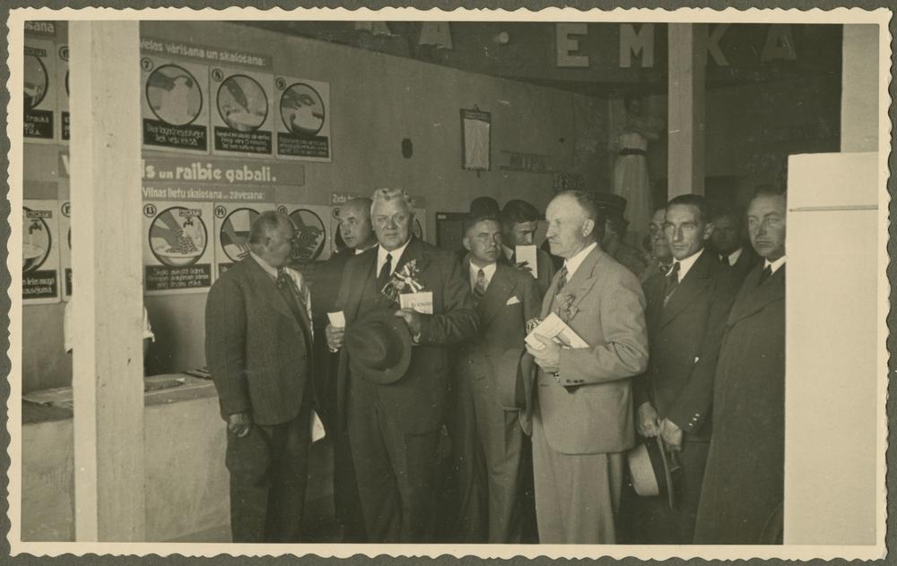 Latvijas Valsts un Ministru prezidents Kārlis Ulmanis ķīmiskās fabrikas "Mārtiņš Kalniņš" paviljonā, viesojoties Latgales Lauksaimniecības izstādē Otro Latvijas Pļaujas svētku laikā Rēzeknē. No kreisās: 3. Kārlis Ulmanis, 6. Latvijas Lauksaimniecības kameras priekšsēdētājs Rūdolfs Dzērve.