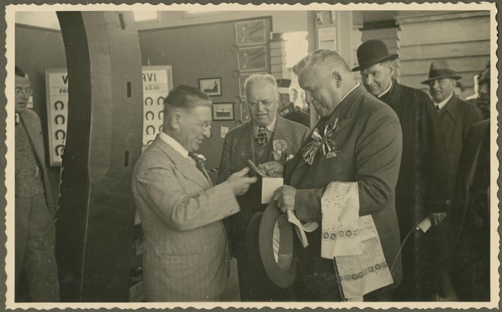 Latvijas Valsts un Ministru prezidents Kārlis Ulmanis saņem piemiņas pakavu rūpniecības paviljonā, viesojoties Latgales Lauksaimniecības izstādē Otro Latvijas Pļaujas svētku laikā Rēzeknē. No kreisās: 4. Kārlis Ulmanis, 5. izglītības ministra biedrs, garīdznieks Jāzeps Čamanis.