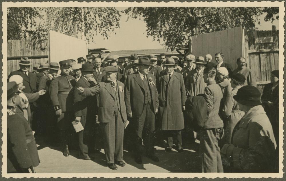 Latvijas Valsts un Ministru prezidents Kārlis Ulmanis (centrā) ar viņu pavadošajām personām apmeklē lopkopības paviljonu, viesojoties Latgales Lauksaimniecības izstādē Otro Latvijas Pļaujas svētku laikā Rēzeknē.