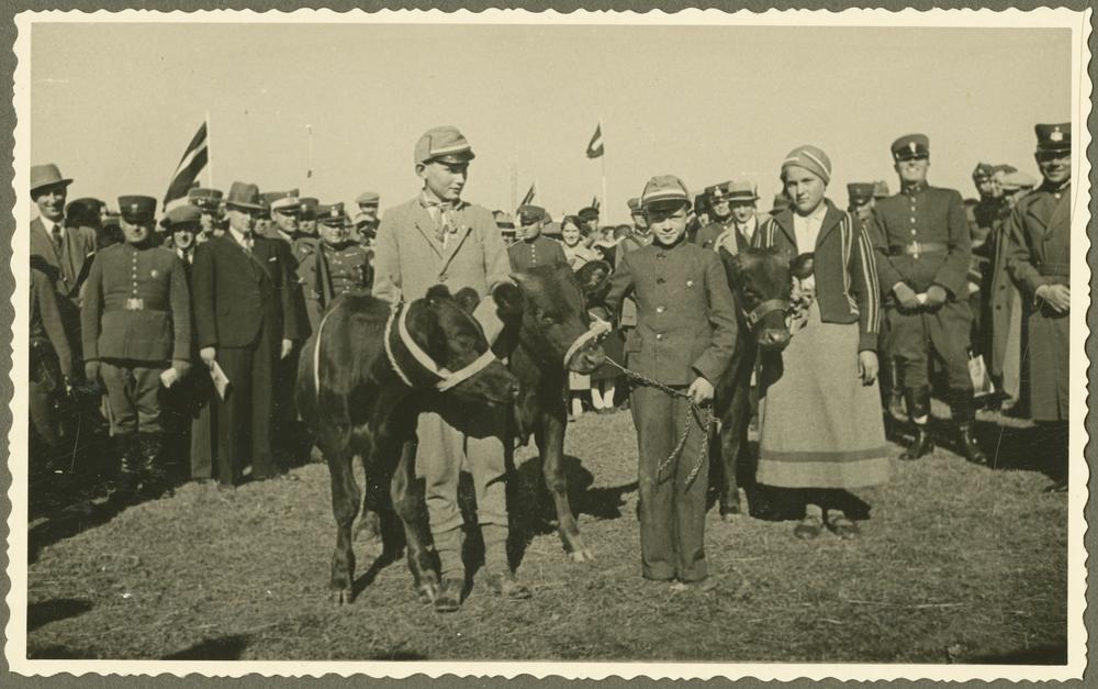 Brāļu Skrindu mazpulka biedri - 14 gadus vecā Olga Puklovska, 14 gadus vecais Jānis Višņevskis un 11 gadus vecais Jānis Oškalns - demonstrē pašu izaudzētos godalgotos teļus Latgales Lauksaimniecības izstādē Otro Latvijas Pļaujas svētku laikā Rēzeknē.