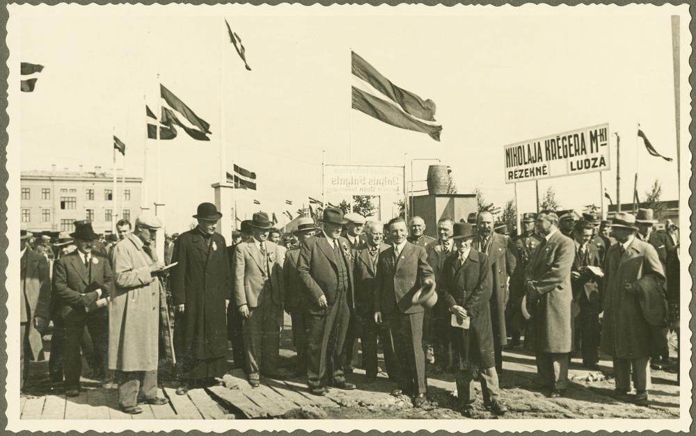 Latvijas Valsts un Ministru prezidents Kārlis Ulmanis ar pavadošajām personām apmeklē Latgales Lauksaimniecības izstādi Otro Latvijas Pļaujas svētku laikā Rēzeknē. Fonā izkārtne "Nikolaja Krēgera M-ki. Rēzeknē, Ludzā". 1. rindā no kreisās: 3. izglītības ministra biedrs, garīdznieks Jāzeps Čamanis, 5. Kārlis Ulmanis.