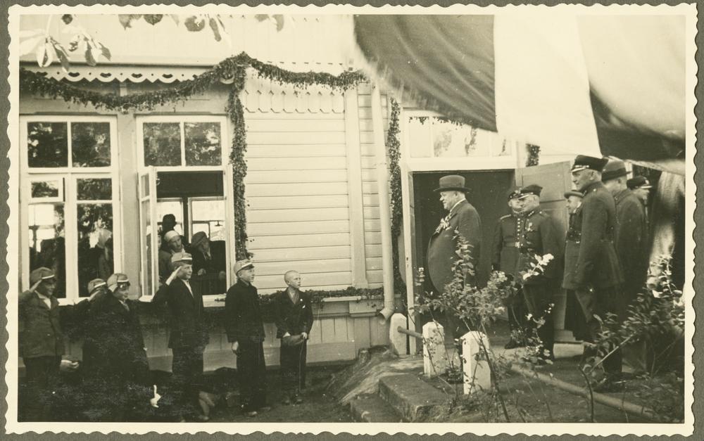 Pamatskolas skolēni sveic Latvijas Valsts un Ministru prezidents Kārli Ulmani Latgales Lauksaimniecības izstādē, Otro Latvijas Pļaujas svētku laikā Rēzeknē.