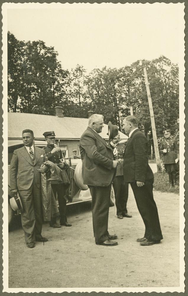 Latvijas Valsts un Ministru prezidents Kārlis Ulmanis sasveicinās ar pamatskolas un bērnu patversmes priekšnieku Jāni Ladusānu, viesojoties Adamovas sešklasīgajā pamatskolā un bērnu patversmē pēc Otro Latvijas Pļaujas svētku apmeklēšanas Rēzeknē. No kreisās: 3. Kārlis Ulmanis, 5. Jānis Ladusāns.