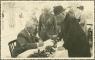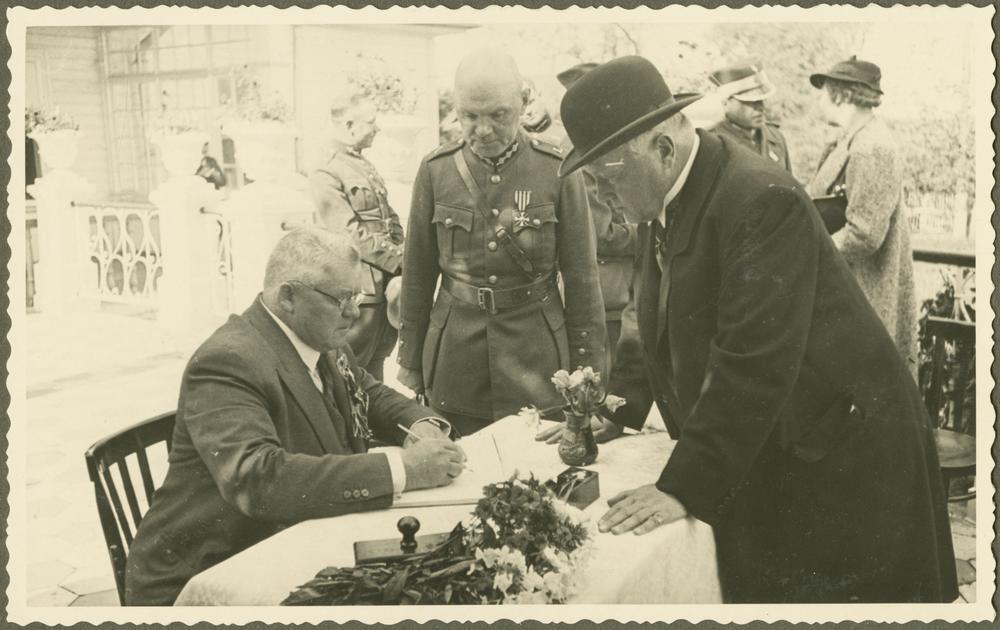 Latvijas Valsts un Ministru prezidents Kārlis Ulmanis parakstās viesu grāmatā, viesojoties Adamovas pamatskolā un bērnu patversmē pēc Otro Latvijas Pļaujas svētku apmeklēšanas Rēzeknē. Ap galdu, no kreisās: 1. Kārlis Ulmanis, 3. Jānis Balodis.