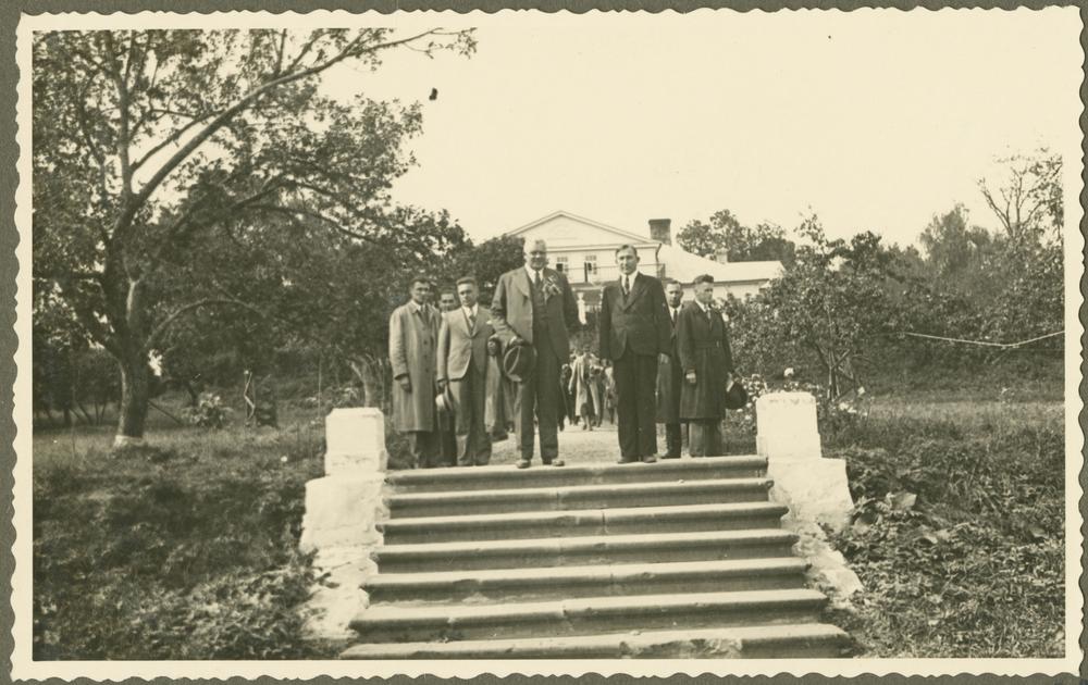 Latvijas Valsts un Ministru prezidents Kārlis Ulmanis apmeklē Adamovas sešklasīgo pamatskolu un bērnu patversmi Rēzeknes apriņķa Vērēmu pagastā. No kreisās: 3. Kārlis Ulmanis, 4. Adamovas pamatskolas un bērnu patversmes priekšnieks Jānis Ladusāns.