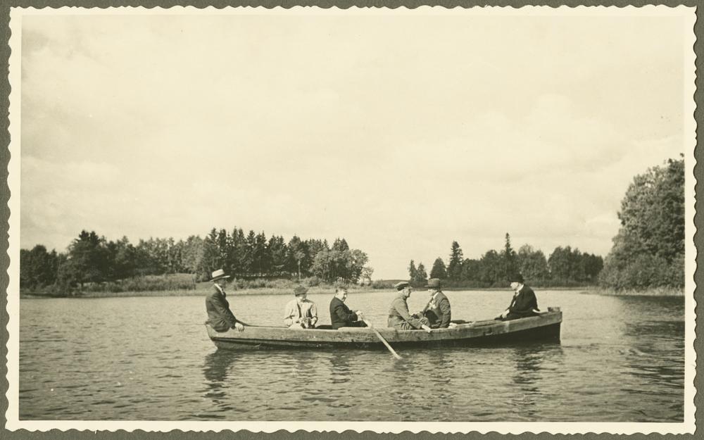 Latvijas Valsts un Ministru prezidents Kārlis Ulmanis vizinās ar laivu Adamovas ezerā, viesojoties Adamovas pamatskolā un bērnu patversmē Rēzeknes apriņķa Vērēmu pagastā. No kreisās: 3. Adamovas pamatskolas un bērnu patversmes priekšnieks Jānis Ladusāns, 5. Kārlis Ulmanis, 6. kara ministrs Jānis Balodis.