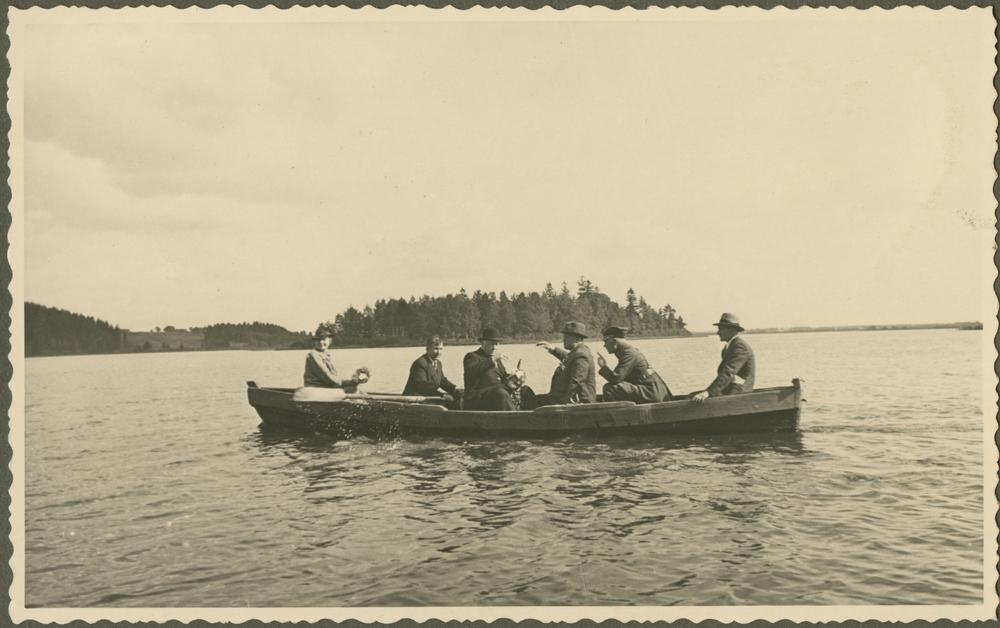 Latvijas Valsts un Ministru prezidents Kārlis Ulmanis vizinās ar laivu Adamovas ezerā, viesojoties Adamovas pamatskolā un bērnu patversmē Rēzeknes apriņķa Vērēmu pagastā. No kreisās: 2. Adamovas pamatskolas un bērnu patversmes priekšnieks Jānis Ladusāns, 3. kara ministrs Jānis Balodis, 4. Kārlis Ulmanis.