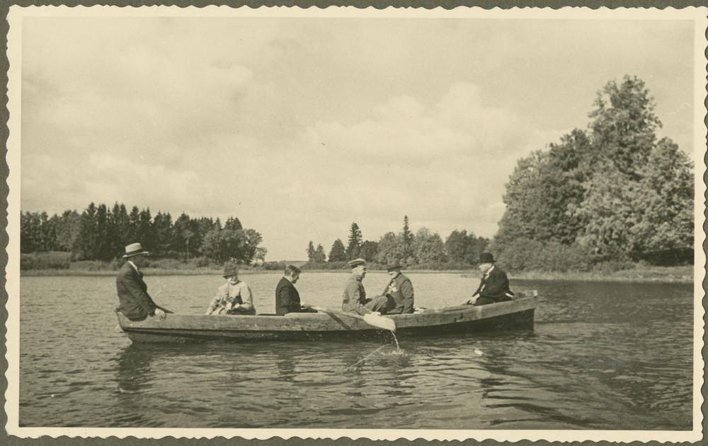 Latvijas Valsts un Ministru prezidents Kārlis Ulmanis vizinās ar laivu Adamovas ezerā, viesojoties Adamovas pamatskolā un bērnu patversmē Rēzeknes apriņķa Vērēmu pagastā. No kreisās: 3. Adamovas pamatskolas un bērnu patversmes priekšnieks Jānis Ladusāns, 5. Kārlis Ulmanis, 6. kara ministrs Jānis Balodis.