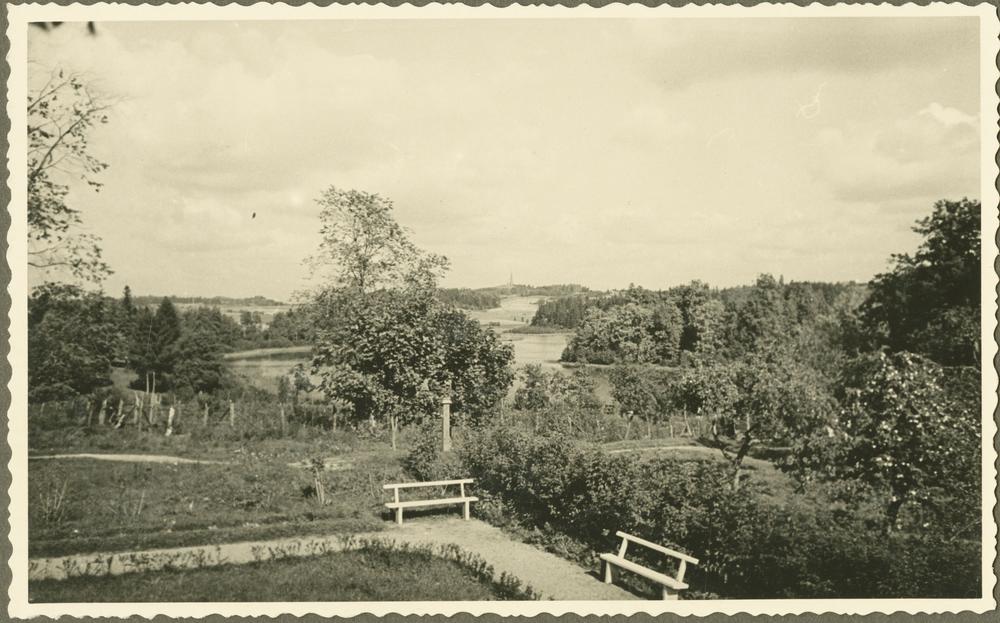 Adamovas ezers Rēzeknes apriņķa Vērēmu pagastā. Priekšplānā soliņi un ābele.