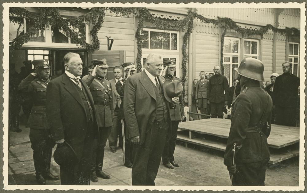 Latvijas Valsts un Ministru prezidents Kārlis Ulmanis un kara ministrs Jānis Balodis dzelzceļa stacijā Rēzekne II pirms atgriešanās Rīgā pēc Otro Latvijas Pļaujas svētku un Latgales Lauksaimniecības izstādes apmeklēšanas. Priekšplānā no kreisās: 1. Jānis Balodis, 2. Kārlis Ulmanis.