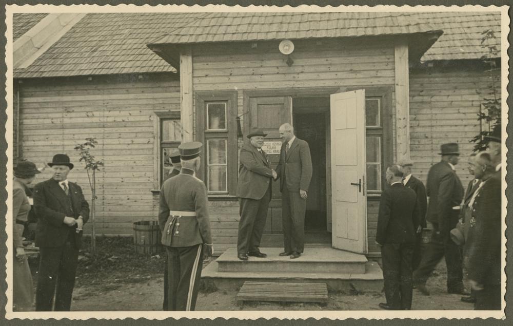 Latvijas Valsts un Ministru prezidents Kārlis Ulmanis un kara ministrs Jānis Balodis aplūko Krustpils dzelzceļa aizsargu organizācijas jauno ēku, atgriežoties no vizītes Rēzeknē, kur apmeklēja Otros Latvijas Pļaujas svētkus. No kreisās: 2. Jānis Balodis, 5. Kārlis Ulmanis.