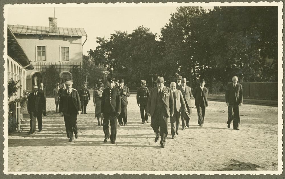 Latvijas Valsts un Ministru prezidents Kārlis Ulmanis (priekšplānā 1. no labās) un viņu pavadošās personas kādā no Pļaviņu pilsētas ielām.