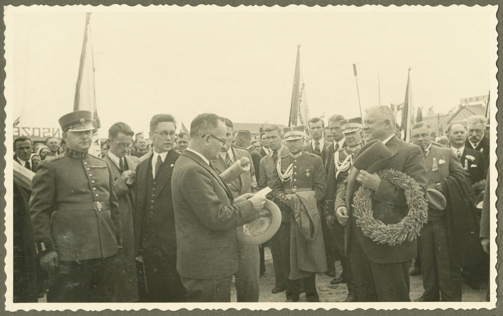 Rīgas pilsētas galva Roberts Liepiņš sveic Latvijas Valsts un Ministru prezidentu Kārli Ulmani Otrajos Latvijas Pļaujas svētkos Rēzeknē. Priekšplānā no kreisās: 1. Roberts Liepiņš, 2. Kārlis Ulmanis. 2. rindā no labās: 1. izglītības ministrs Augusts Tentelis, 2. finanšu ministrs Ludvigs Ēķis, 3. Ministru prezidenta biedrs Marģers Skujenieks.