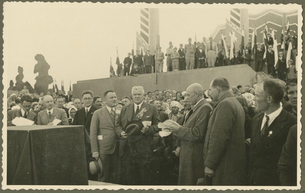Latvijas Valsts un Ministru prezidents Kārlis Ulmanis un zemkopības ministrs Jānis Birznieks Otrajos Latvijas Pļaujas svētkos Rēzeknē. Fonā - brīvdabas uzveduma "Svētā zeme" dekorācijas (režisors un scenogrāfs Jānis Muncis). 1. rindā no kreisās: 4. Jānis Birznieks, 5. Kārlis Ulmanis.