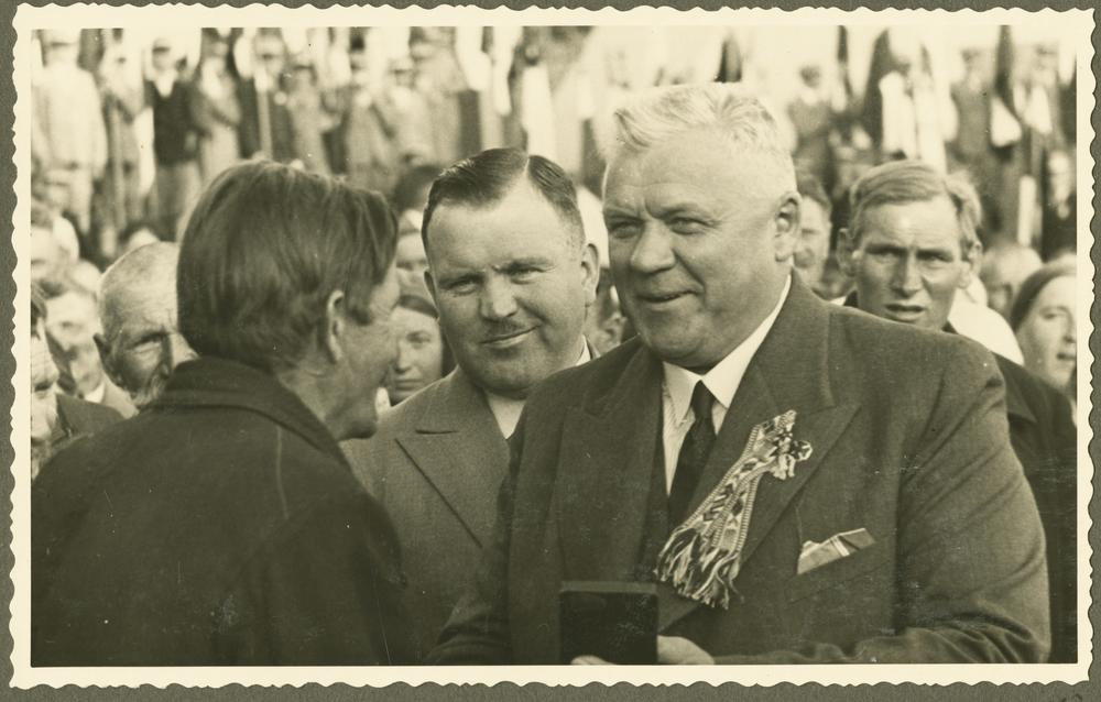 Latvijas Valsts un Ministru prezidents Kārlis Ulmanis un zemkopības ministrs Jānis Birznieks Otrajos Latvijas Pļaujas svētkos Rēzeknē. No kreisās: 2. Jānis Birznieks, 3. Kārlis Ulmanis.