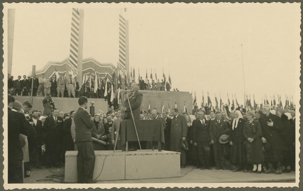 Latvijas Valsts un Ministru prezidents Kārlis Ulmanis uzrunā brīvdabas uzveduma "Svētā zeme" skatītājus Otrajos Latvijas Pļaujas svētkos Rēzeknē.