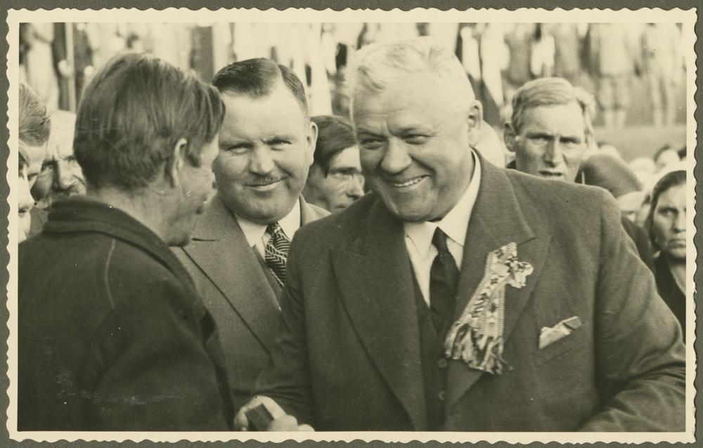 Latvijas Valsts un Ministru prezidents Kārlis Ulmanis un zemkopības ministrs Jānis Birznieks Otrajos Latvijas Pļaujas svētkos Rēzeknē. No kreisās: 2. Jānis Birznieks, 3. Kārlis Ulmanis.