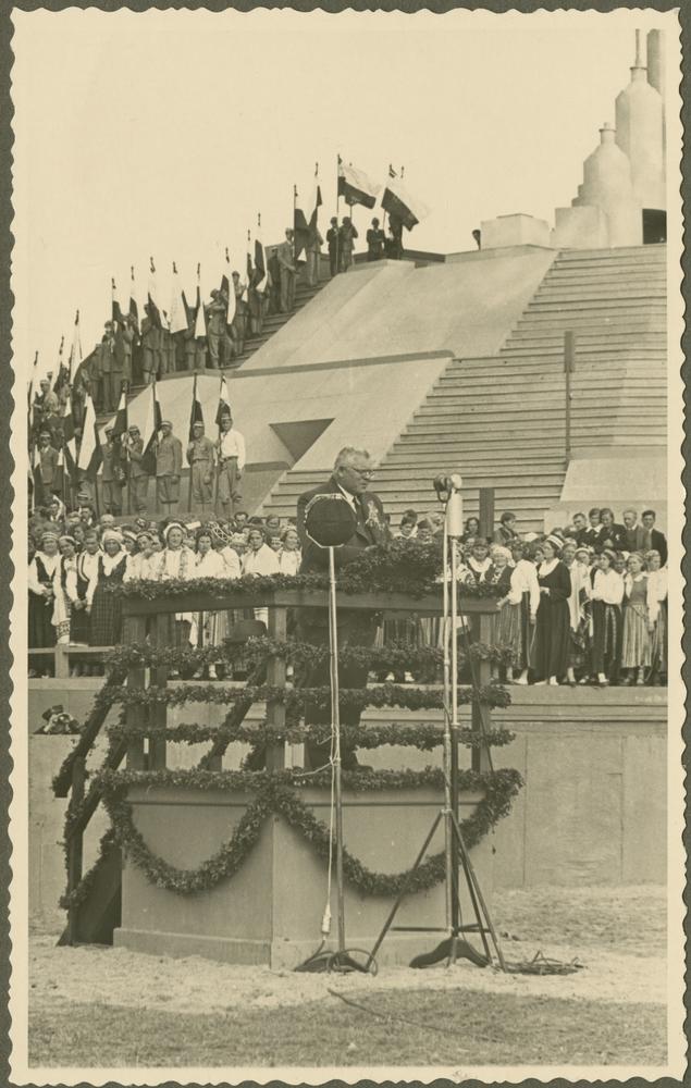 Latvijas Valsts un Ministru prezidents Kārlis Ulmanis uzrunā Otro Latvijas Pļaujas svētku apmeklētājus no tribīnes. Fonā - brīvdabas uzveduma "Svētā zeme" dekorācijas (režisors un scenogrāfs Jānis Muncis).