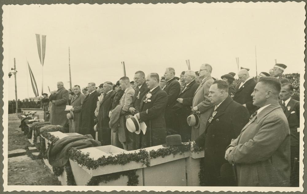 Latvijas Valsts un Ministru prezidents Kārlis Ulmanis un valdības pārstāvji Otrajos Latvijas Pļaujas svētkos Rēzeknē. Valdības ložā 1. rindā no kreisās: 1. Kārlis Ulmanis, 2. zemkopības ministrs Jānis Birznieks, 3. kara ministrs Jānis Balodis, 5. Ministru prezidenta biedrs Marģers Skujenieks, 7. ārlietu ministrs Vilhelms Munters, 8. iekšlietu ministrs Vilis Gulbis, 9. finanšu ministrs Ludvigs Ēķis. 2. rindā: 1. izglītības ministra biedrs, garīdznieks Jāzeps Čamanis, 2. Valsts kontrolieris Jānis Kaminskis, 3. Rīgas pilsētas galva Roberts Liepiņš.