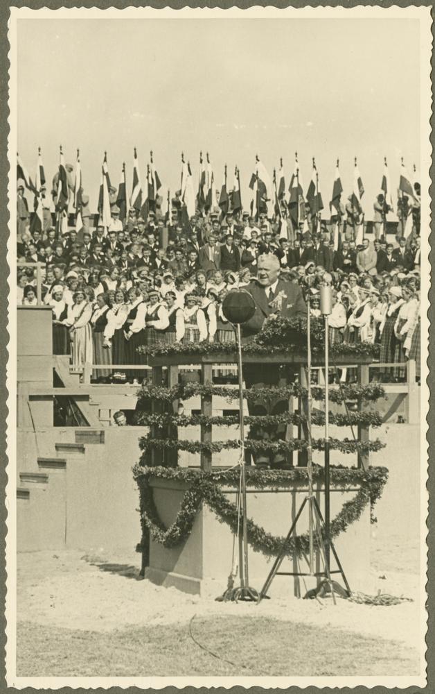 Latvijas Valsts un Ministru prezidents Kārlis Ulmanis uzrunā Otro Latvijas Pļaujas svētku apmeklētājus no tribīnes.