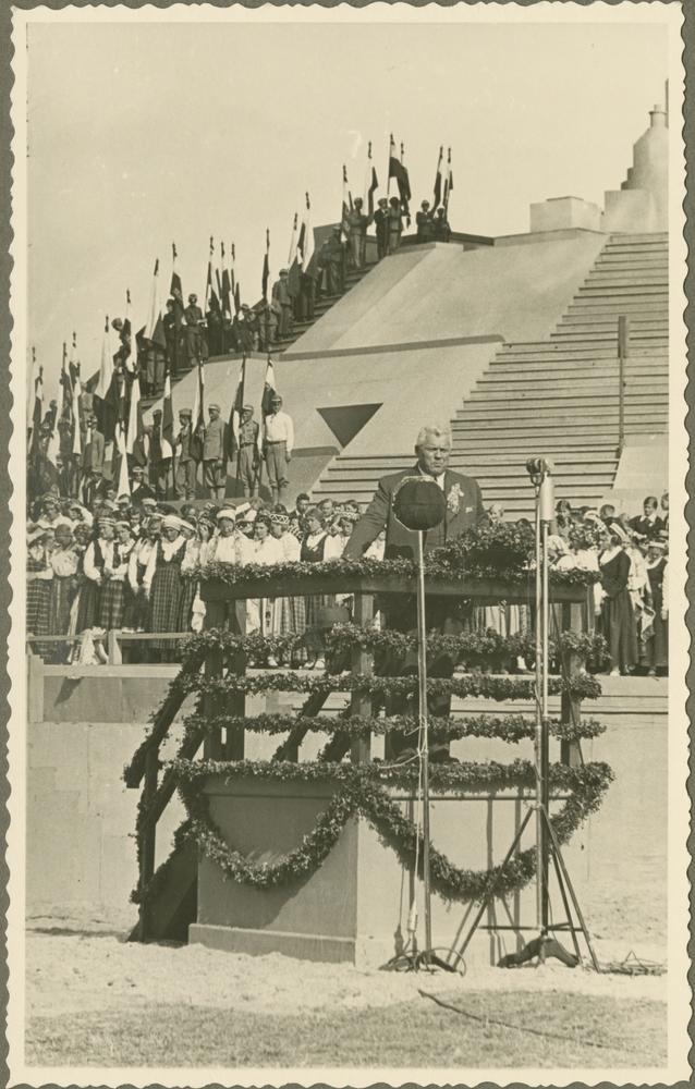 Latvijas Valsts un Ministru prezidents Kārlis Ulmanis uzrunā Otro Latvijas Pļaujas svētku apmeklētājus no tribīnes.