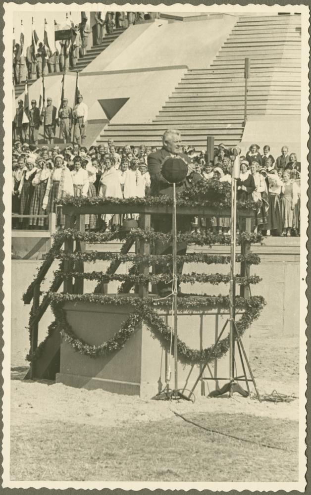 Latvijas Valsts un Ministru prezidents Kārlis Ulmanis uzrunā Otro Latvijas Pļaujas svētku apmeklētājus no tribīnes.