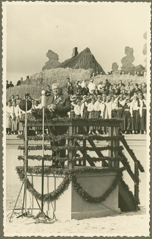 Latvijas Valsts un Ministru prezidents Kārlis Ulmanis uzrunā Otro Latvijas Pļaujas svētku apmeklētājus no tribīnes. Fonā - brīvdabas uzveduma "Svētā zeme" dekorācijas (režisors un scenogrāfs Jānis Muncis).