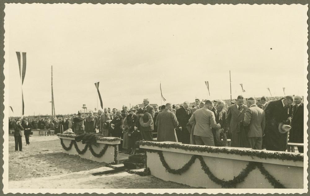 Latvijas Valsts un Ministru prezidents Kārlis Ulmanis un valdības pārstāvji Otrajos Latvijas Pļaujas svētkos Rēzeknē. Valdības ložā 1. rindā no labās: 1. iekšlietu ministrs Vilis Gulbis, 3. ārlietu ministrs Vilhelms Munters, 4. kara ministrs Jānis Balodis, 6. izglītības ministrs Augusts Tentelis, 8. Kārlis Ulmanis.