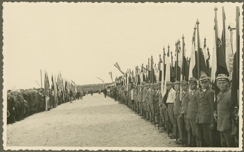 Otrie Latvijas Pļaujas svētki Rēzeknē. Mazpulku ierinda ar karogiem.