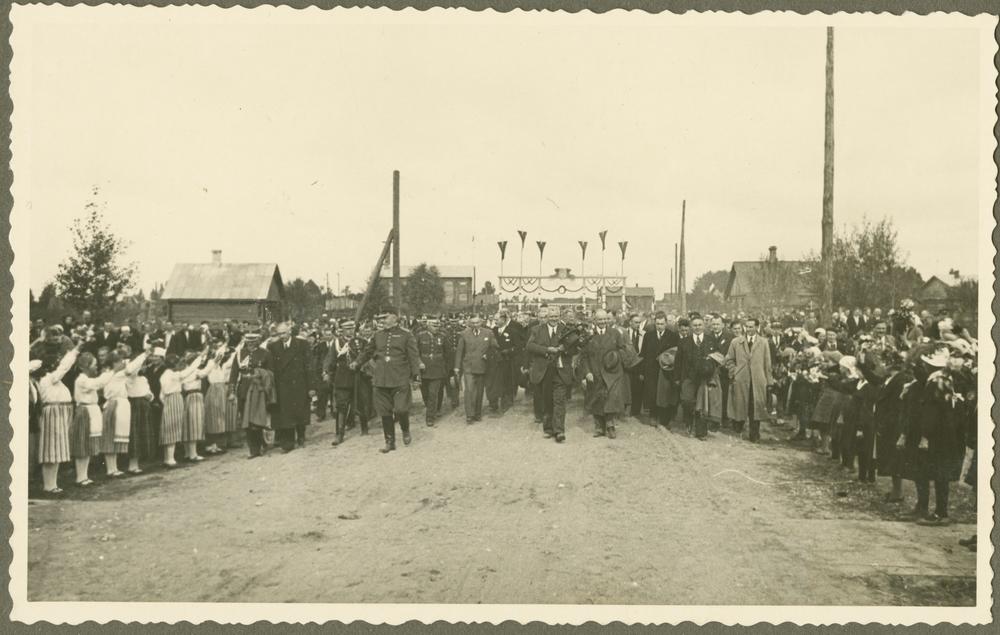 Latvijas valdības pārstāvji ierodas Otrajos Latvijas Pļaujas svētkos Rēzeknē. 1. rindā no kreisās: 7. Latvijas Valsts un Ministru prezidents Kārlis Ulmanis, 8. Latvijas Lauksaimniecības kameras priekšsēdētājs Rūdolfs Dzērve.