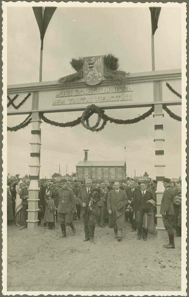 Latvijas valdības pārstāvji ierodas Otrajos Latvijas Pļaujas svētkos Rēzeknē. 1. rindā no kreisās: 2. Latvijas Valsts un Ministru prezidents Kārlis Ulmanis, 3. Latvijas Lauksaimniecības kameras priekšsēdētājs Rūdolfs Dzērve.