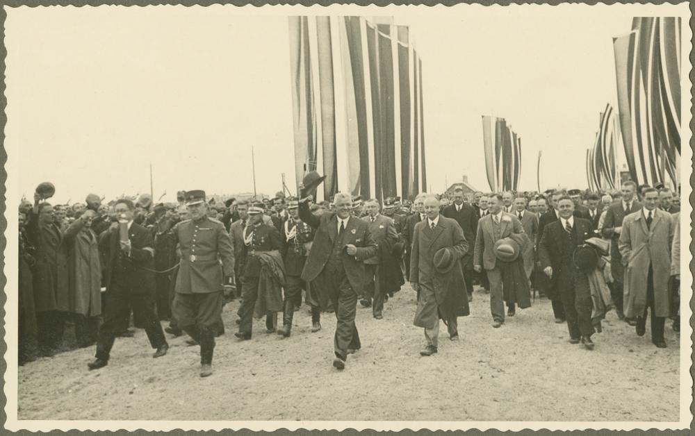 Latvijas valdības pārstāvji ierodas Otrajos Latvijas Pļaujas svētkos Rēzeknē. Gājiena priekšgalā no kreisās: 3. Latvijas Valsts un Ministru prezidents Kārlis Ulmanis, 4. Latvijas Lauksaimniecības kameras priekšsēdētājs Rūdolfs Dzērve, 5. zemkopības ministrs Jānis Birznieks.