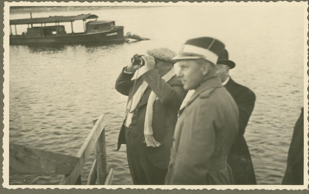 Latvijas Valsts un Ministru prezidents Kārlis Ulmanis Daugavas krastā netālu no Staburaga, Sēlpils pagastā. No kreisās: 1. Kārlis Ulmanis, 2. prezidenta adjutants Miervaldis Lūkins, 3. kara ministrs Jānis Balodis.