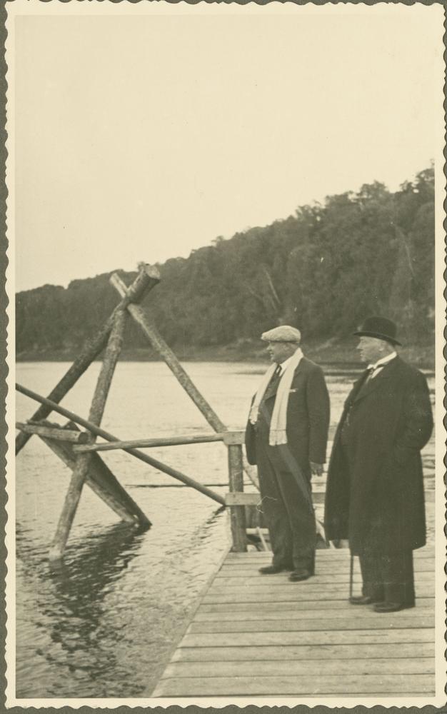 Latvijas Valsts un Ministru prezidents Kārlis Ulmanis un kara ministrs Jānis Balodis Daugavas krastā netālu no Staburaga, Sēlpils pagastā. No kreisās: 1. Kārlis Ulmanis, 2. Jānis Balodis.