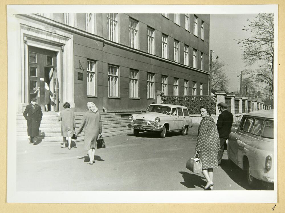 Rīgas pilsētas 6. apvienotās slimnīcas galvenā ieeja. Slimnīca atradās Dzirciema ielā 24. Priekšplānā cilvēki un vieglās automašīnas "Volga".