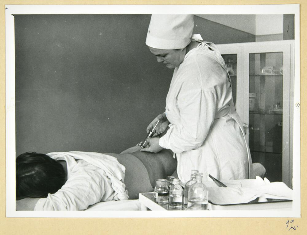 Rīgas pilsētas 6. apvienotās slimnīcas medmāsa veic pacientam injekciju. Slimnīca atradās Dzirciema ielā 24.