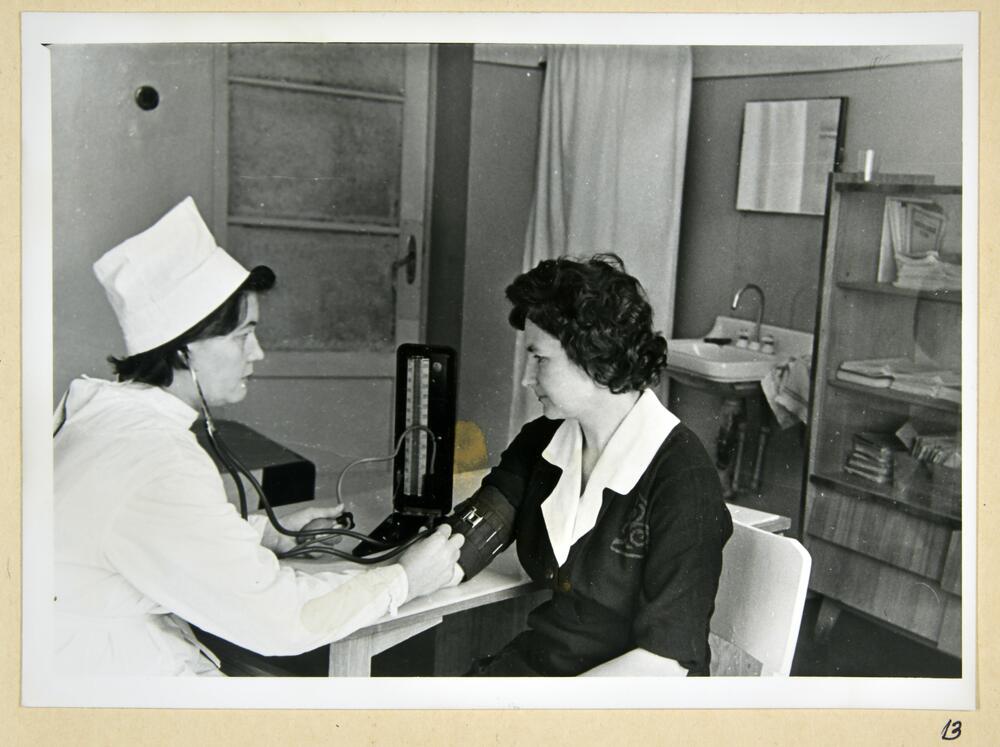 Rīgas pilsētas 6. apvienotās slimnīcas medmāsa mēra pacientei asinsspiedienu.