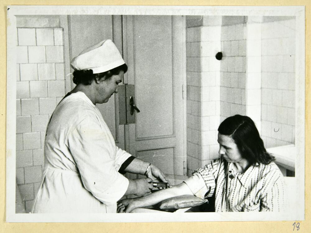 Rīgas pilsētas 6. apvienotās slimnīcas medmāsa procedūru kabinetā ņem pacientei asins no vēnas. Slimnīca atradās Dzirciema ielā 24.