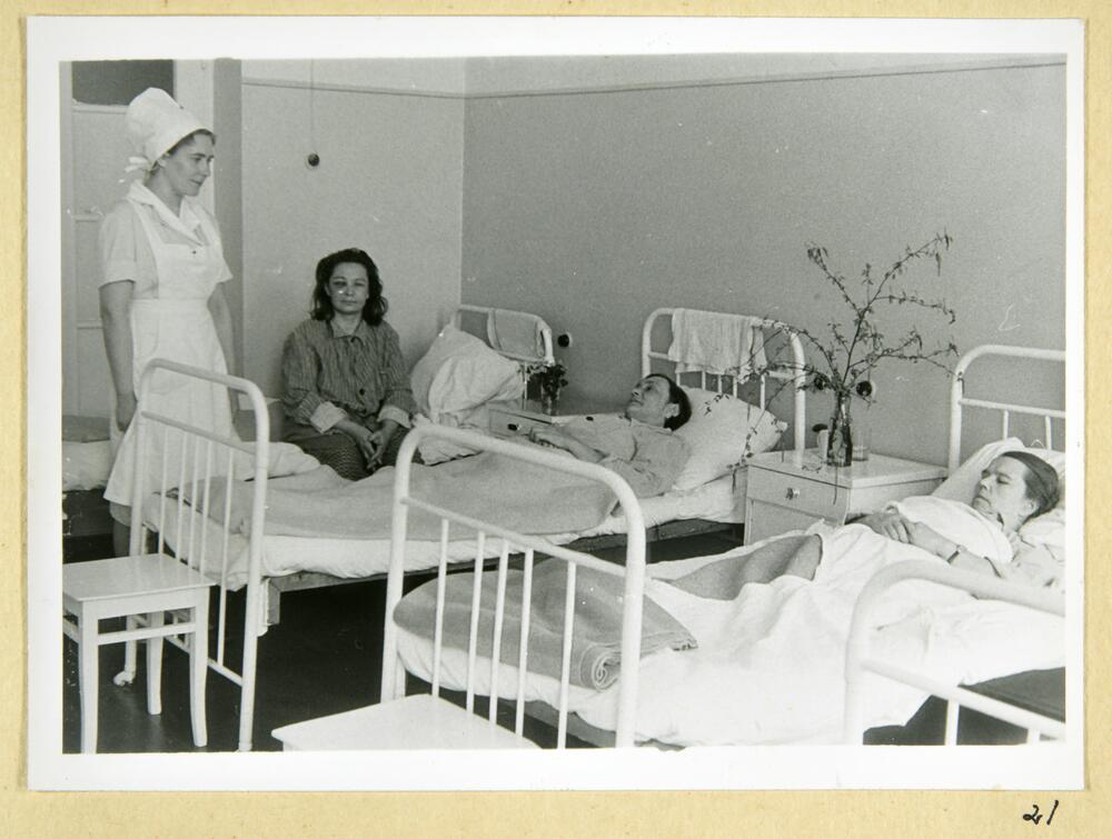 Rīgas pilsētas 6. apvienotās slimnīcas medmāsa palātā apskata slimniekus rīta apgaitas laikā.