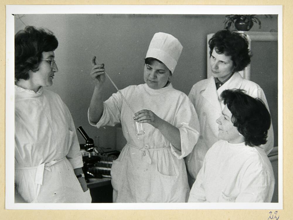 Rīgas pilsētas 6. apvienotās slimnīcas medmāsas apgūst blakus specialitātes. Medmāsa demonstrē eksperimentu ar kolbu un pipeti.