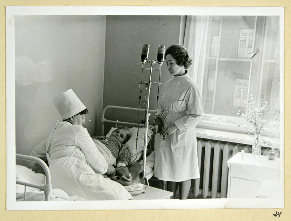 Rīgas pilsētas 6. apvienotās slimnīcas medmāsas veic pacientes apskati. Slimnīca atradās Dzirciema ielā 24.