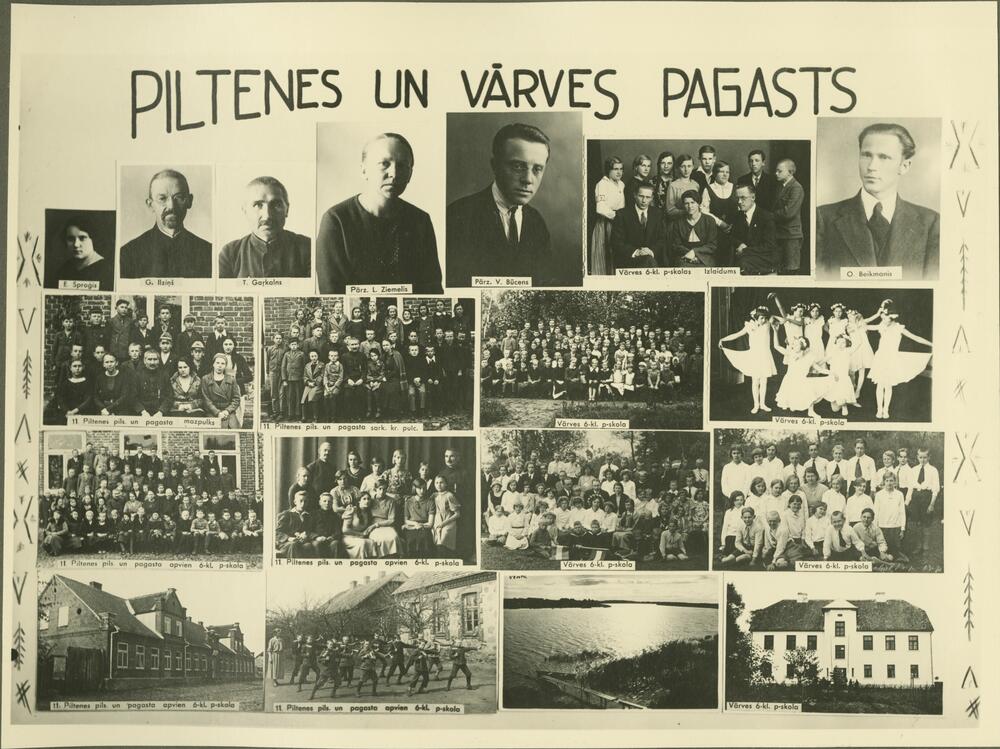 Piltenes un Vārves pagastu skolas un izglītības darbinieki. 1. rindā no kreisās: 1. E. Sproģe, 2. G. Ilziņš, 3. T. Garkalns, 4. skolas pārzinis L. Ziemelis, 5. skolas pārzinis V. Būcens, 6. Vārves 6 klašu pamatskolas audzēkņu izlaidums, 7. O. Beikmanis. 2. rindā no kreisās: 1. XI Piltenes pilsētas un pagasta mazpulku organizācijas dalībnieku kopbilde, 2. XI Piltenes pilsētas un pagasta Sarkanā Krusta pulciņa dalībnieku kopbilde, 3. Vārves 6 klašu pamatskolas audzēkņu kopbilde, 4. Vārves 6 klašu pamatskolas audzēkņu kopbilde. 3. rindā no kreisās: 1. XI Piltenes pilsētas un pagasta apvienotā 6 klašu pamatskolas audzēkņu kopbilde, 2. Piltenes pilsētas un pagasta apvienotās pamatskolas audzēkņu un skolotāju kopbilde, 3. Vārves 6 klašu pamatskolas skolēnu kopbilde, 4. Vārves 6 klašu pamatskolas skolēnu kopbilde. 4. rindā no kreisās: 1. XI Piltenes pilsētas un pagasta apvienotās pamatskolas ēka, 2. XI Piltenes apvienotās pamatskolas audzēkņu kopbilde, 3. skats uz Ventas upi, 4. Vārves 6 klašu pamatskolas ēka. Fotomontāža.